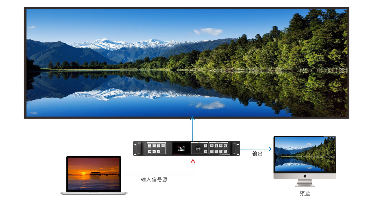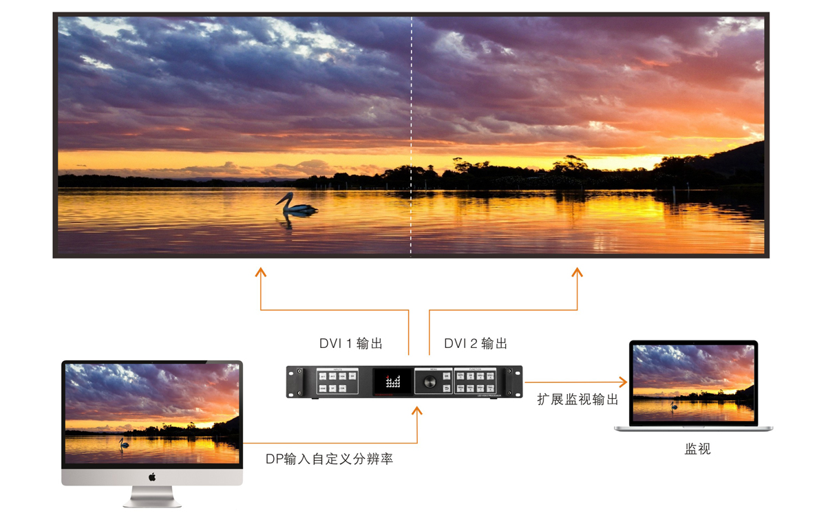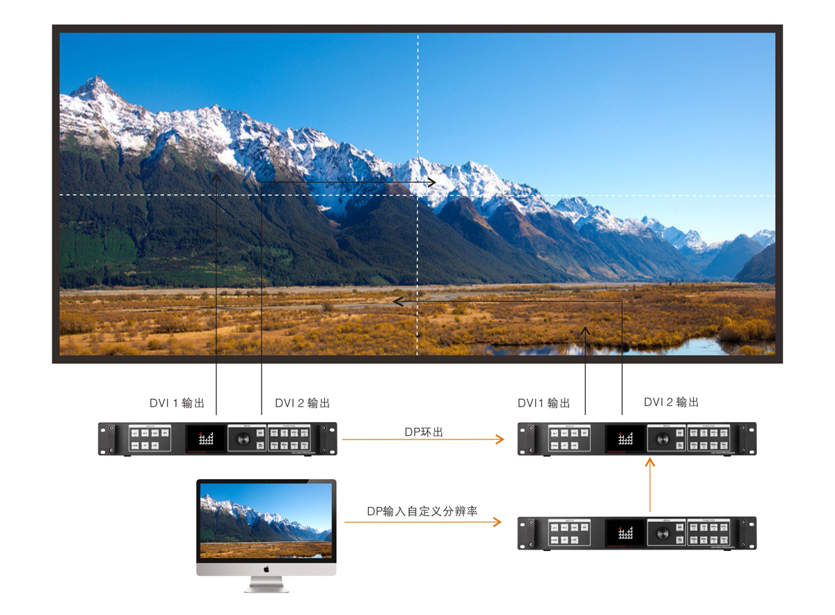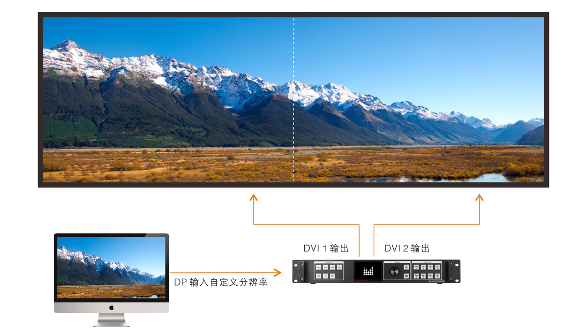 LED-560E配备2个DVI输入口,使用分屏功能,配合自定义输出分辨率功能,可完成4K/4K以内任意点对点水平和垂直拼接。