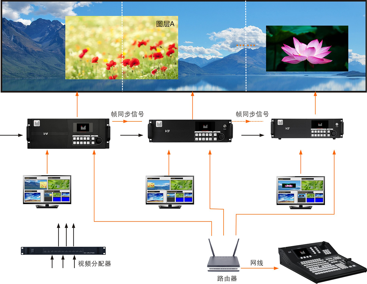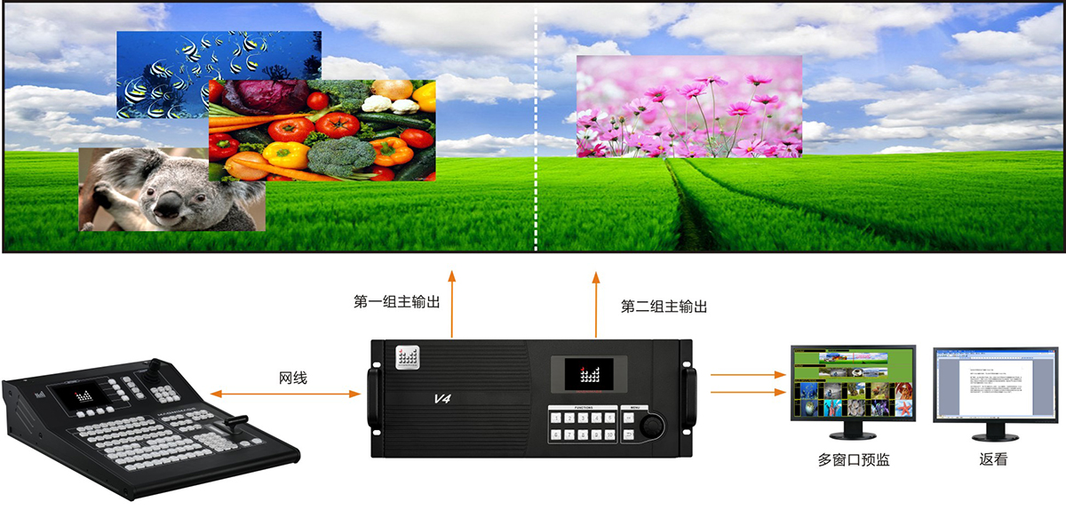 单台H1可控制9台V4、V3、V2主机混合级联,支持多台主机分组控制;内置30种预设,实现多机多场景之间无缝切换;
